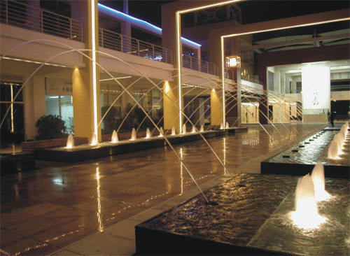 波光噴泉加上燈光的元素使水景具備立體效果,在晚間足夠吸引你的眼球。水線(xiàn)穿池而出單而高的噴、小而飄逸的泉更強化了起伏效果。
