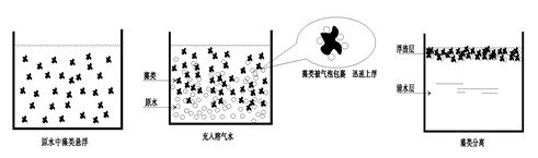 氣浮是目前公認的高效的藻類(lèi)去除工藝。在大型自來(lái)水廠(chǎng)中去除藻類(lèi)也使用氣浮技術(shù)。氣浮去除藻類(lèi)的原理如下圖示意: