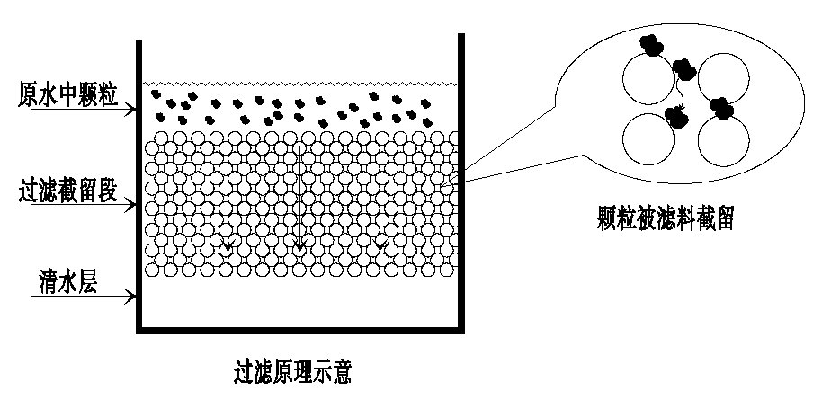 過(guò)濾則廣泛應用于去除泥沙濁度,它主要是依靠濾料(石英砂等)攔截水中的泥沙顆粒。過(guò)濾的原理示意如下圖: